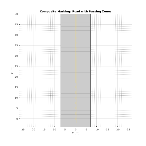 road(scenario,roadCenters,'Lanes',ls); figMark = figure; set(figMark,'Position',[0 0 600 600]); hPlot = axes(figMark); plot(scenario,'Parent',hPlot); title('Composite Marking: Road with Passing Zones')