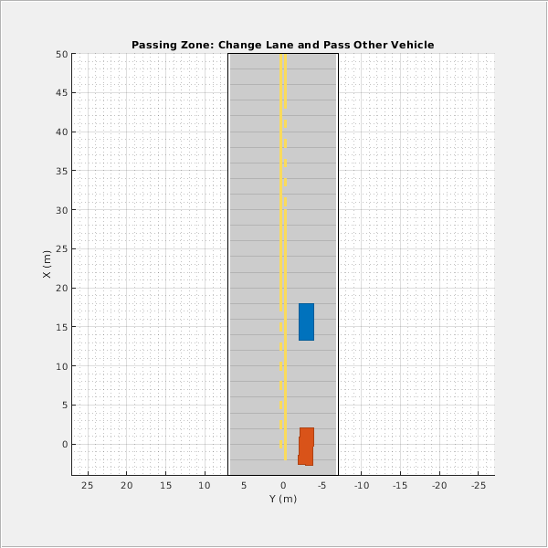 close all; figScene = figure; set(figScene,'Position',[0 0 600 600]); hPanel = uipanel(figScene); hPlot = axes(hPanel); plot(scenario,'Parent',hPlot); title('Passing Zone: Change Lane and Pass Other Vehicle') % Run the simulation while advance(scenario) pause(0.01) end