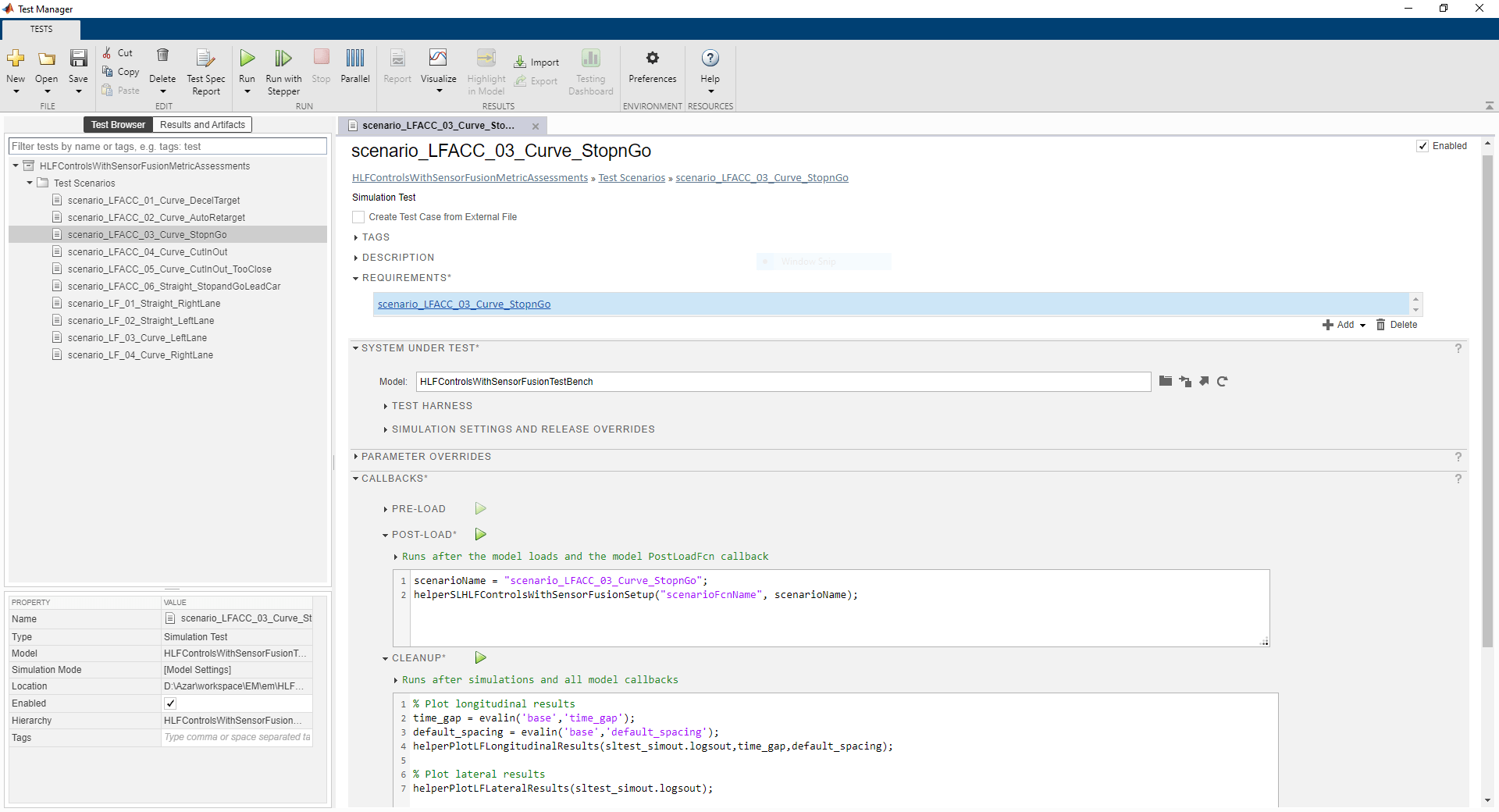 Каждый тест использует коллбэк POST-LOAD, чтобы запустить скрипт настройки с соответствующими входными параметрами. После симуляции теста менеджер по Тесту вызывает helperGenerateFilesForLaneFollowingWithSensorFusionReport от коллбэка ОЧИСТКИ, чтобы сгенерировать графики.
