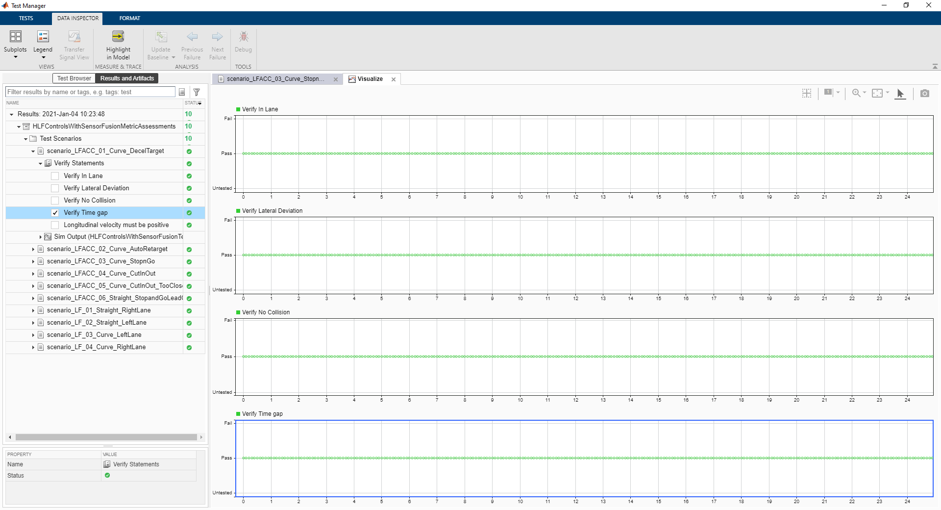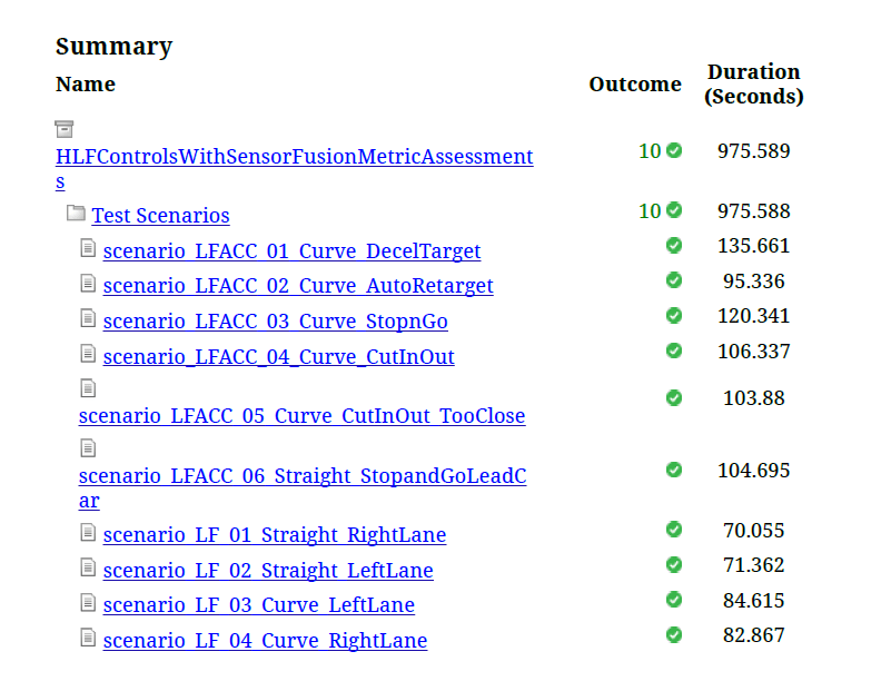 testFile = sltest.testmanager.load('HLFControlsWithSensorFusionMetricAssessments.mldatx'); testSuite = getTestSuiteByName(testFile,'Test Scenarios'); testCase = getTestCaseByName(testSuite,'scenario_LFACC_03_Curve_StopnGo'); resultObj = run(testCase);