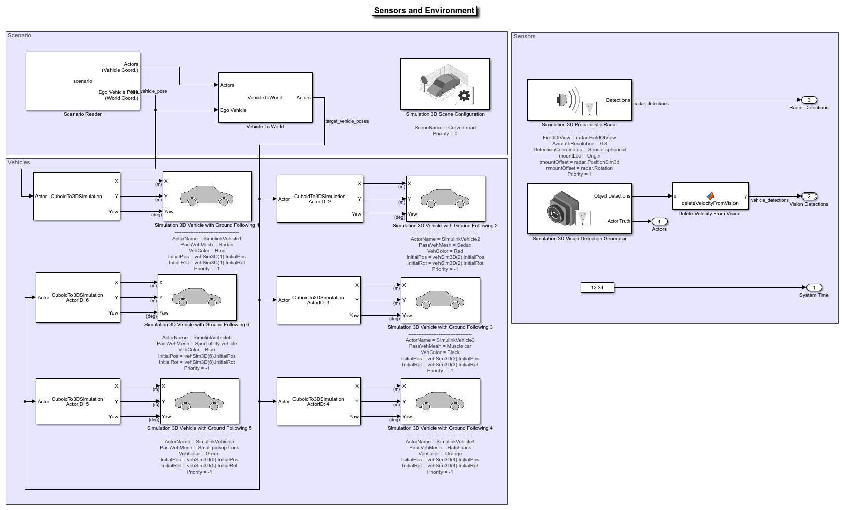 Подсистема Датчиков и Среды конфигурирует дорожную сеть, транспортные средства мест, и синтезирует датчики. Для примера, который использует подобную подсистему, смотрите, что Хайвей Лейн Следует. Откройте подсистема Среды и Датчики.