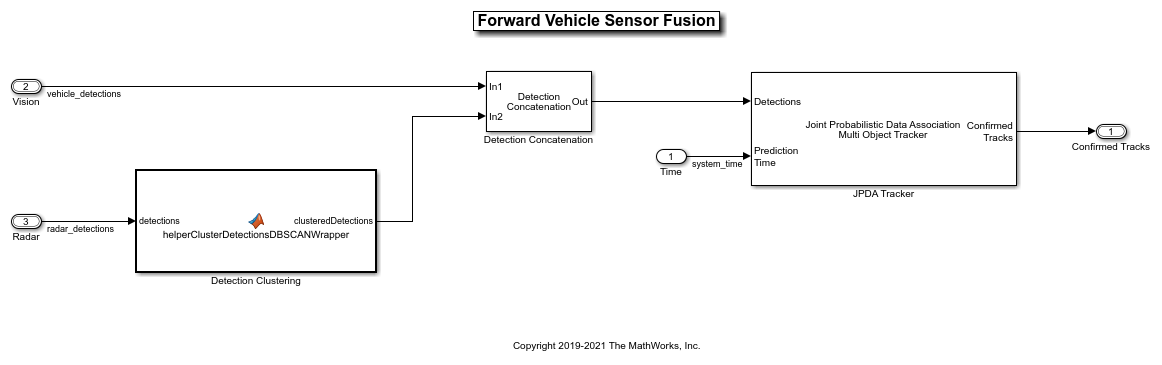 Модель Forward Vehicle Sensor Fusion является образцом модели, что видение процессов и радарные обнаружения и генерируют положение и скорость дорожек относительно автомобиля, оборудованного датчиком. Откройте Прямой образец модели Cочетания датчиков Транспортного средства.