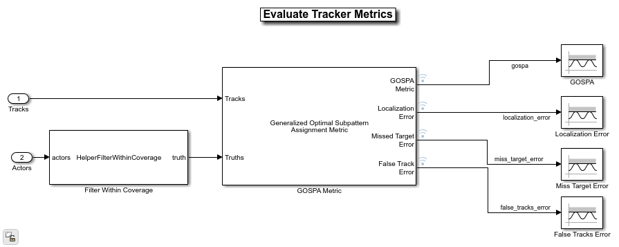 Оцените Метрики Средства отслеживания — Эта подсистема оценивает эффективность средства отслеживания с помощью метрики GOSPA между набором дорожек и их основными истинами.