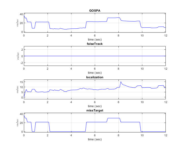 Графики показывают, что ошибка локализации в основном составляет метрику GOSPA. Заметьте, что пропущенный целевой компонент первоначально начинает с более высокого значения из-за задержки установления средства отслеживания и понижается, чтобы обнулить через какое-то время. Другой peaks в пропущенной кривой целевых значений происходит из-за той же задержки, когда желтые и фиолетовые целевые транспортные средства входят в зоне охвата датчиков.