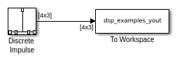 Блок Discrete Impulse генерирует импульс (значение 1) на выходной выборке D+1, где вы задаете D использование параметра Delay (D≥ 0 ). Все выходные предыдущие выборки и после демонстрационного D+1 нуль.