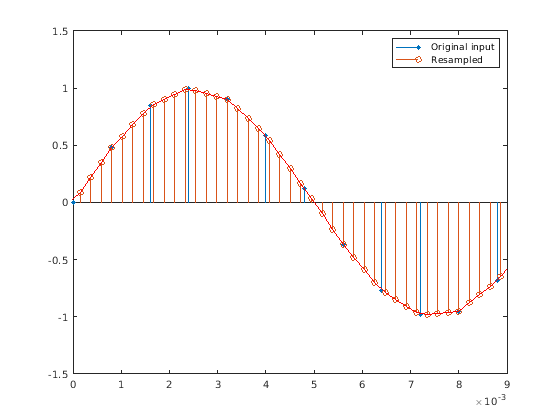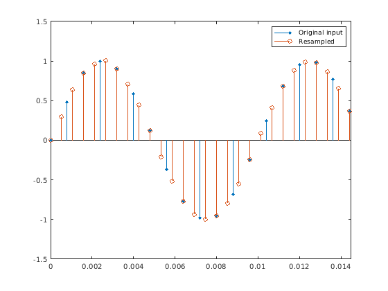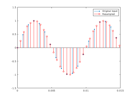 upsampler увеличивает частоту дискретизации сигнала факторным L, и downsampler уменьшает частоту дискретизации сигнала факторным M. Используйте повышающую дискретизацию и субдискретизацию факторов, которые являются относительно главными или взаимно-простыми. Получившийся сигнал дискретного времени имеет частоту дискретизации, которая является L/M раз от исходной частоты дискретизации.