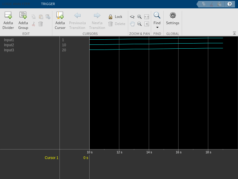В этом примере показано, как использовать функции, чтобы создать, управлять и удалить курсоры в dsp.LogicAnalyzer объект.