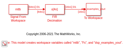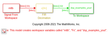 Блок FIR Decimation передискретизирует входные параметры вектора или матрицы по первому измерению. КИХ decimator (как показано в схематическом) концептуально состоит из сглаживающегося КИХ-фильтра, сопровождаемого downsampler. Чтобы спроектировать КИХ-фильтр сглаживания, используйте designMultirateFIR функция.