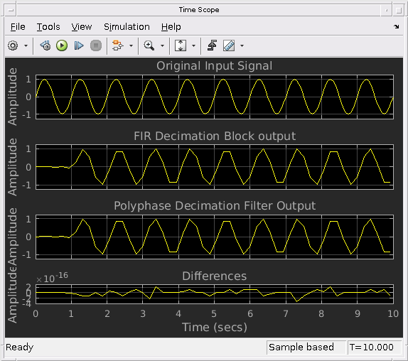 Allow multirate processing — Блок десятикратно уменьшает сигнал, таким образом, что выходная частота дискретизации является временами M медленнее, чем входная частота дискретизации.
