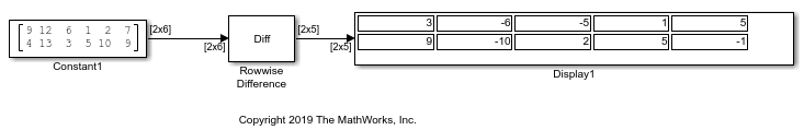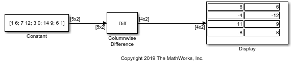 Первая часть модели показывает выход блока Difference, когда Рабочий параметр различия устанавливается на No и Различие вдоль параметра установлено в Columns.
