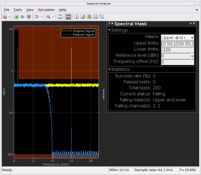 [~,mdl] = fileparts(tempname); open_system(new_system(mdl,'FromTemplate','dsp_basic_filter')); saBlock = find_system(mdl,'BlockType','SpectrumAnalyzer'); scopeConfig = get_param(saBlock{1},'ScopeConfiguration'); upperMask = [0 50; 1200 50; 1200 -10; 24000 -10]; scopeConfig.SpectralMask.UpperMask = upperMask; scopeConfig.SpectralMask.LowerMask = -100; scopeConfig.SpectralMask.EnabledMasks = 'Upper and lower'; sim(mdl,'StopTime','20');