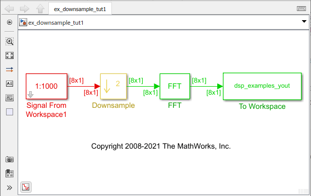 Во вкладке Debug выберите Information Overlays> Signal Dimensions. Когда вы запускаете модель, размерности сигналов появляются рядом с линиями, соединяющими блоки. Размерности сигнала в модели подтверждают, что формат кадра сигнала уменьшается на коэффициент 2 между вводом и выводом блока Downsample.