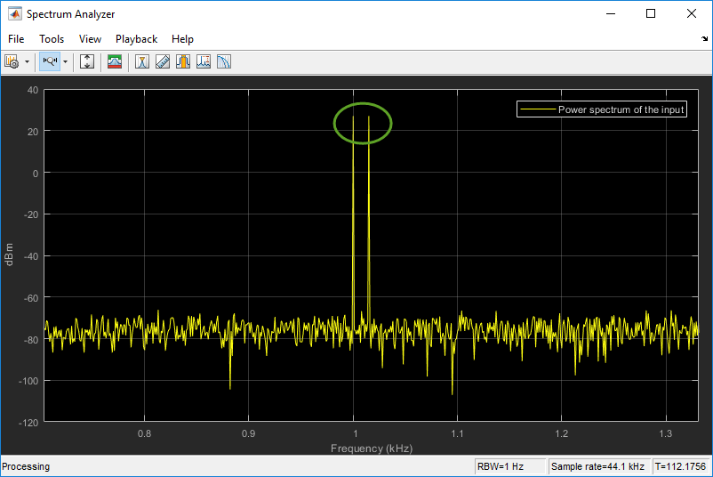 SA.RBWSource = 'property'; SA.RBW = 1; for Iter = 1:5000 Sinewave1 = Sineobject1(); Sinewave2 = Sineobject2(); Input = Sinewave1 + Sinewave2; NoisyInput = Input + 0.001*randn(1024,1); SA(NoisyInput); end release(SA);