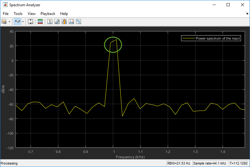 . Спектр анализатор в этом примере показывает односторонний спектр. Следовательно, RBW (44100/2)/1024 или 21.53 Гц