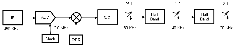Обычное вниз процесс преобразования запускается с выборки аналогового сигнала на уровне, который удовлетворяет критерию Найквиста несущей. Возможный вариант состоял бы в том, чтобы произвести входной сигнал на 450 кГц на уровне 2,0 МГц, затем с помощью цифрового вниз конвертер, чтобы выполнить комплексный перевод в основную полосу, фильтр и вниз выборку 25 с Каскадным интегрально-гребенчатым (CIC) фильтром, и затем проредить 4 с парой полуленточных фильтров. Такую реализацию показывают ниже:
