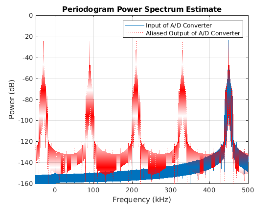[y,ys,Fs] = loadadcio; Fs_altDDC = 1.2e5; % Sampling frequency [Hys,Fys] = periodogram(ys,[],[],Fs,'power','centered'); N = length(Fys); figure('color','white') periodogram(y,[],[],Fs,'power','centered'); clear y; hold on; plot((-(ceil(N/2*9)-1):floor(N/2*9))/N*Fs_altDDC/1000, ... repmat(10*log10(Hys),9,1),'r:'); axis([-50 500 -160 0]) legend('Input of A/D Converter','Aliased Output of A/D Converter', ... 'Location','NorthEast');
