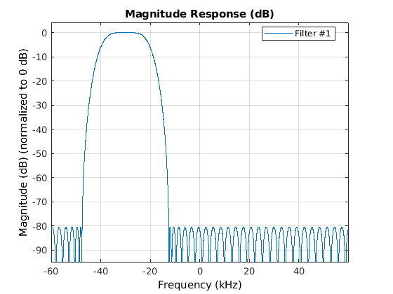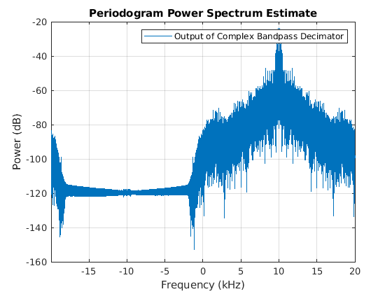 % Design a complex bandpass filter. Include the decimate-by-2 halfband % filter into the design by specifying a decimation factor of 2*M: bp = dsp.ComplexBandpassDecimator(M*2 , -30e3, Fs_altDDC,... 'TransitionWidth',TW); % Visualize the filter response visualizeFilterStages(bp); % Filter the output of the 120 kHz A/D converter yf = bp(ys); figure('color','white') periodogram(yf,[],[],dhbfilter.Fs_out,'power','centered'); legend('Output of complex bandpass decimator') player(real(yf));