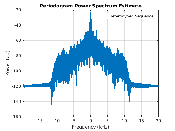 yht = ycbp.*(-1i).^(0:length(ycbp)-1).'; figure('color','white') periodogram(yht,[],[],designLowpass.Fs_out,'power','centered'); legend('Heterodyned Sequence')