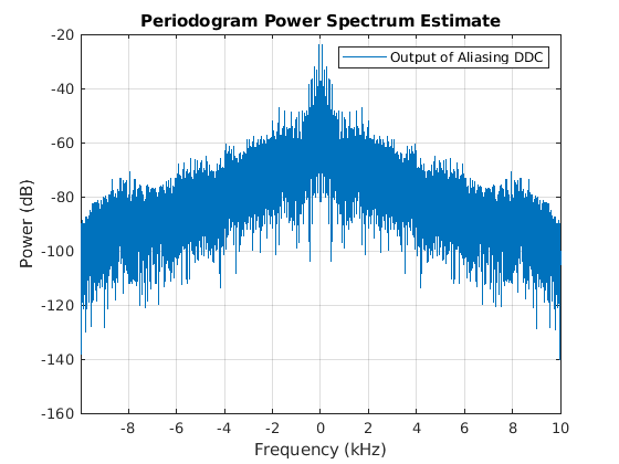 yf = hbfilter(yht); figure('color','white') periodogram(yf,[],[],dhbfilter.Fs_out,'power','centered'); legend('Output of Aliasing DDC')