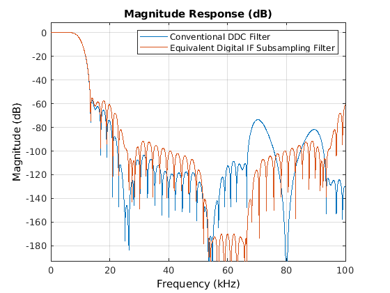set(fvt, ... 'Filters',{normDDCFilter,altDDCFilter}, ... 'FrequencyRange','Specify freq. vector', ... 'FrequencyVector',linspace(0,100e3,2048), ... 'Fs',[Fs_normDDC,Fs_altDDC], ... 'ShowReference','off', ... 'Color','White'); legend(fvt,'Conventional DDC Filter', ... 'Equivalent Digital IF Subsampling Filter', ... 'Location','NorthEast');