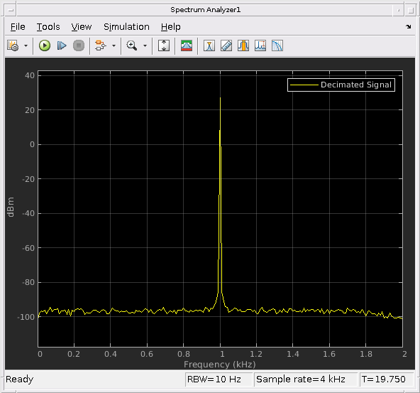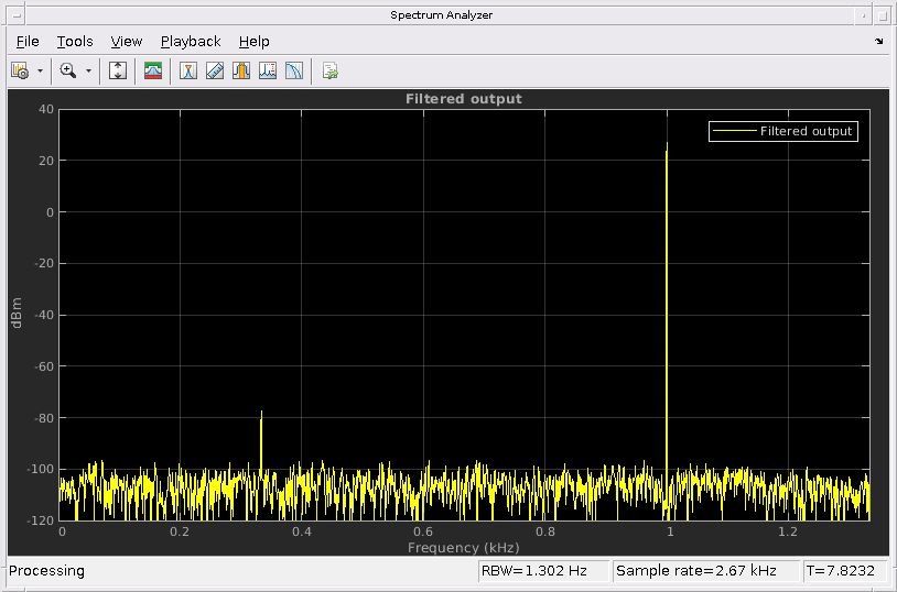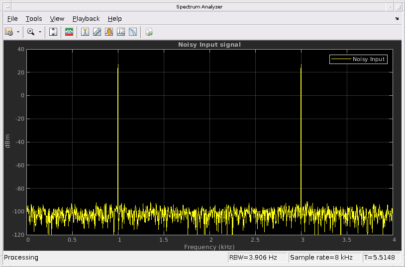 f1 = 1000; f2 = 3000; Fs = 8000; source = dsp.SineWave('Frequency',[f1,f2],'SampleRate',Fs,... 'SamplesPerFrame',1026); specanainput = dsp.SpectrumAnalyzer('SampleRate',Fs,... 'PlotAsTwoSidedSpectrum',false,... 'ShowLegend',true,'YLimits',[-120 40],... 'Title','Noisy Input signal',... 'ChannelNames', {'Noisy Input'}); specanaoutput = dsp.SpectrumAnalyzer('SampleRate',Fs/3,... 'PlotAsTwoSidedSpectrum',false,... 'ShowLegend',true,'YLimits',[-120 40],... 'Title','Filtered output',... 'ChannelNames', {'Filtered output'});