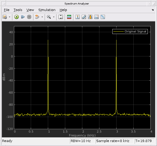 Входной сигнал является шумным синусоидальным сигналом с двумя частотами: один на уровне 1 000 Гц и другой на уровне 3 000 Гц. Частота дискретизации сигнала составляет 8 000 Гц, и Выборки на параметр системы координат блоков Sine wave установлен в 1 026. Шум, добавленный к сигналу, является белым Гауссовым шумом с нулевым средним значением и отклонением 1e-10.