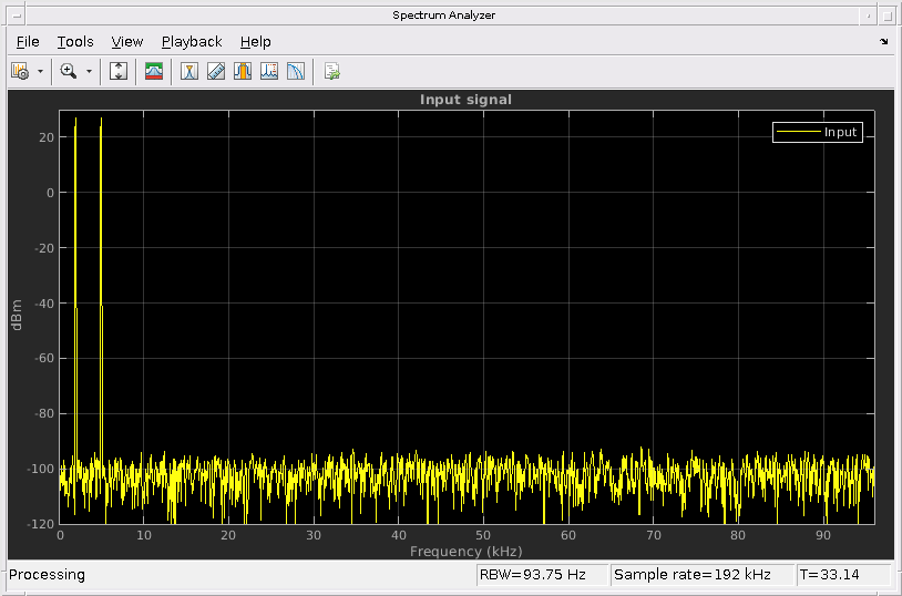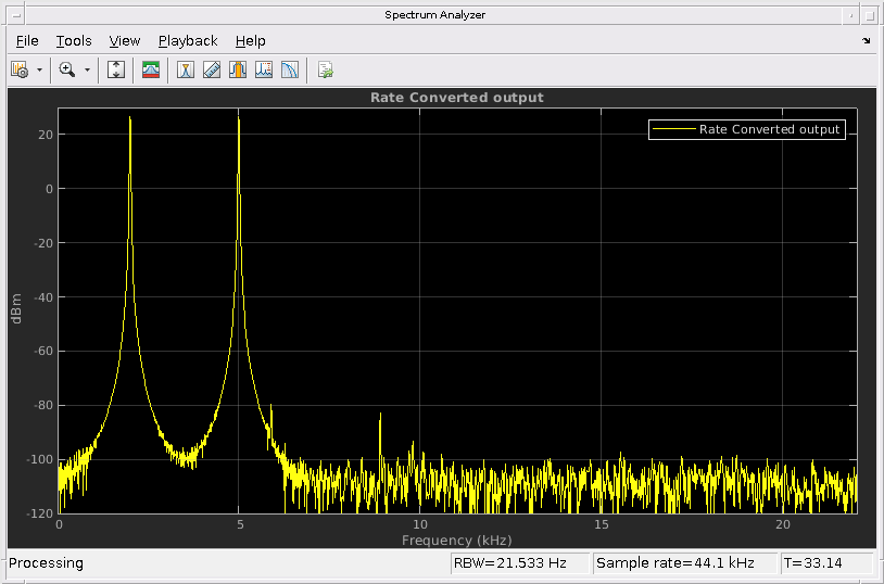 Fsin = SRC.InputSampleRate; Fsout = SRC.OutputSampleRate; specanainput = dsp.SpectrumAnalyzer('SampleRate',Fsin,... 'PlotAsTwoSidedSpectrum',false,... 'ShowLegend',true,'YLimits',[-120 30],... 'Title','Input signal',... 'ChannelNames', {'Input'}); specanaoutput = dsp.SpectrumAnalyzer('SampleRate',Fsout,... 'PlotAsTwoSidedSpectrum',false,... 'ShowLegend',true,'YLimits',[-120 30],... 'Title','Rate Converted output',... 'ChannelNames', {'Rate Converted output'});
