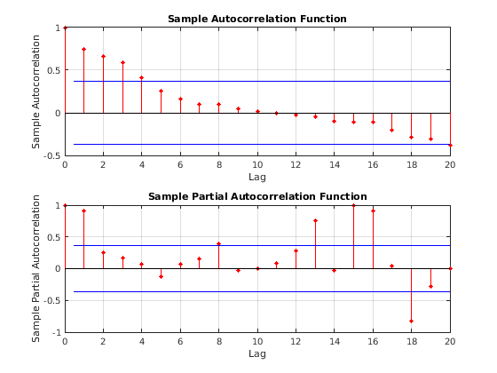 plot(Y); title('Simulated Time Series') xlabel('t') ylabel('Y') subplot(2,1,1) autocorr(Y) subplot(2,1,2) parcorr(Y)