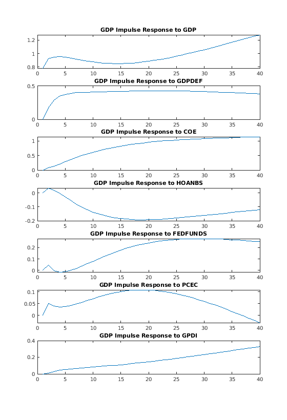 Несмотря на то, что предыдущие графики отображают импульсную характеристику по промежутку 10 лет, каждый ответ на самом деле приближается к установившемуся асимптотическому уровню, указывающему на модульный корень и предполагая, что шоки являются персистентными и оказывают постоянные влияния на номинальный GDP.