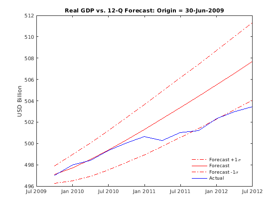 T = datetime(2009,6,30); % Forecast origin just after the crisis (30-Jun-2009 = (2009,6,30) triplet) Fit = estimate(toFit, Y{timerange(Y.Time(1),T,'closed'),:}, 'Model', 'H1'); [yForecast, yMSE] = forecast(Fit, horizon, Y{timerange(Y.Time(1),T,'closed'),:}); sigma = zeros(horizon,1); % Forecast standard errors for i = 1:horizon sigma(i) = sqrt(yMSE{i}(1,1) - 2*yMSE{i}(1,2) + yMSE{i}(2,2)); end forecastDates = dateshift(T, 'end', 'quarter', 1:horizon); figure plot(forecastDates, (yForecast(:,1) - yForecast(:,2)) + sigma, '-.r') hold on plot(forecastDates, yForecast(:,1) - yForecast(:,2), 'r') plot(forecastDates, (yForecast(:,1) - yForecast(:,2)) - sigma, '-.r') plot(forecastDates, Y.GDP(forecastDates) - Y.GDPDEF(forecastDates), 'b') title("Real GDP vs. 12-Q Forecast: Origin = " + string(T)) ylabel('USD Billion') h = legend('Forecast +1\sigma', 'Forecast', 'Forecast -1\sigma', 'Actual', 'Location', 'Best'); h.Box = 'off';