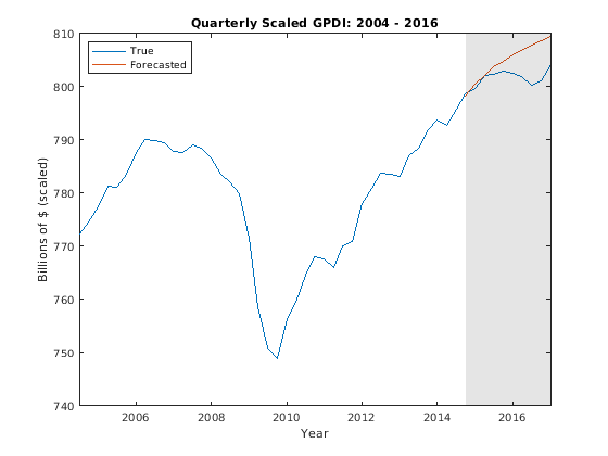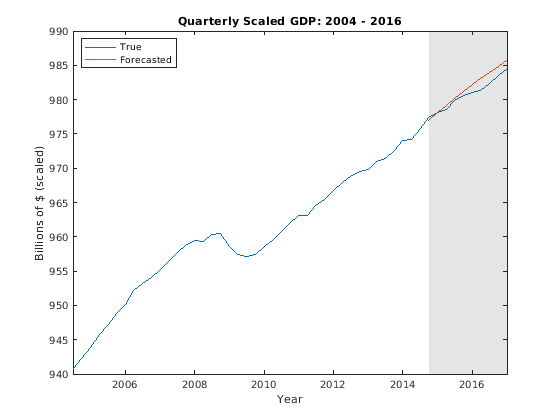 figure; plot(FRED.Time(end - 50:end),FRED.GDP(end - 50:end)); hold on plot(FRED.Time((end - 9):end),YF(:,1)) h = gca; fill(FRED.Time([end - 9 end end end - 9]),h.YLim([1,1,2,2]),'k',... 'FaceAlpha',0.1,'EdgeColor','none'); legend('True','Forecasted','Location','NW') title('Quarterly Scaled GDP: 2004 - 2016'); ylabel('Billions of $ (scaled)'); xlabel('Year'); hold off