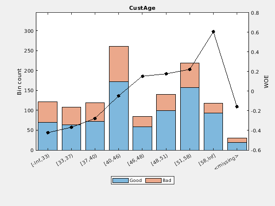 sc = creditscorecard(dataMissing,'IDVar','CustID','BinMissingData',true); sc = autobinning(sc); disp(sc)