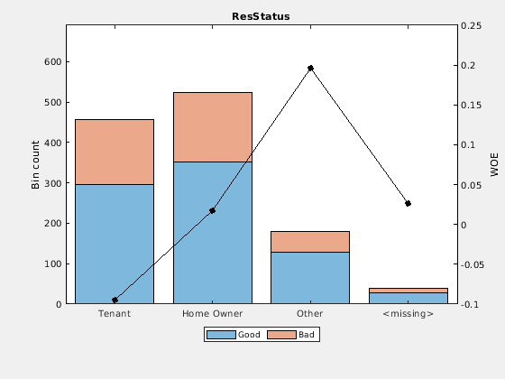 bi = bininfo(sc,'ResStatus','Statistics','WOE'); disp(bi)