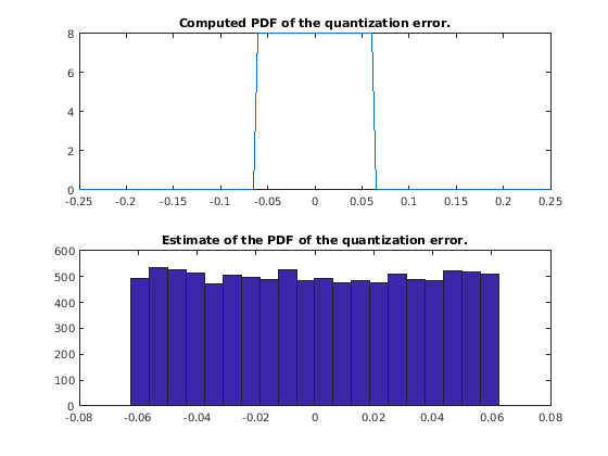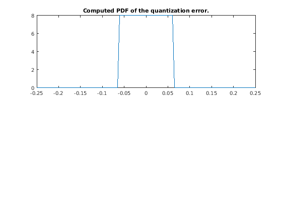 [f,x] = errpdf(q) возвращает функцию плотности вероятности f оцененный в значениях в x. Векторный x содержит равномерно распределенные случайные ошибки квантования, которые являются результатом квантования сигнала quantizer объект q.