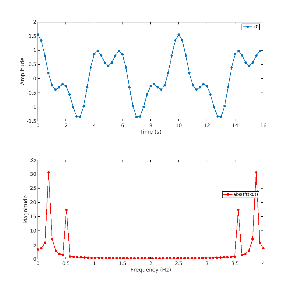 n = 64; % Number of points Fs = 4; % Sampling frequency in Hz t = (0:(n-1))/Fs; % Time vector f = linspace(0,Fs,n); % Frequency vector f0 = 0.2; f1 = 0.5; % Frequencies, in Hz x0 = cos(2*pi*f0*t) + 0.55*cos(2*pi*f1*t); % Time-domain signal x0 = complex(x0); % The textbook algorithm requires the input to be complex y0 = fft(x0); % Frequency-domain transformation fft() is a MATLAB built-in function fi_fft_demo_ini_plot(t,x0,f,y0); % Plot the results from fft and time-domain signal