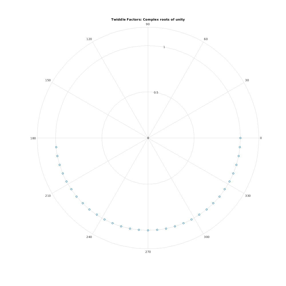 figure(gcf) clf w0 = fi_radix2twiddles(n); polarplot(angle(w0),abs(w0),'o') title('Twiddle Factors: Complex roots of unity')