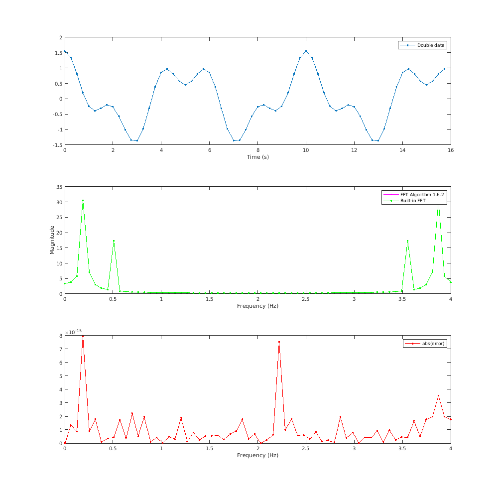 y = fi_m_radix2fft_algorithm1_6_2(x0, w0); fi_fft_demo_plot(real(x0),y,y0,Fs,'Double data', ... {'FFT Algorithm 1.6.2','Built-in FFT'});