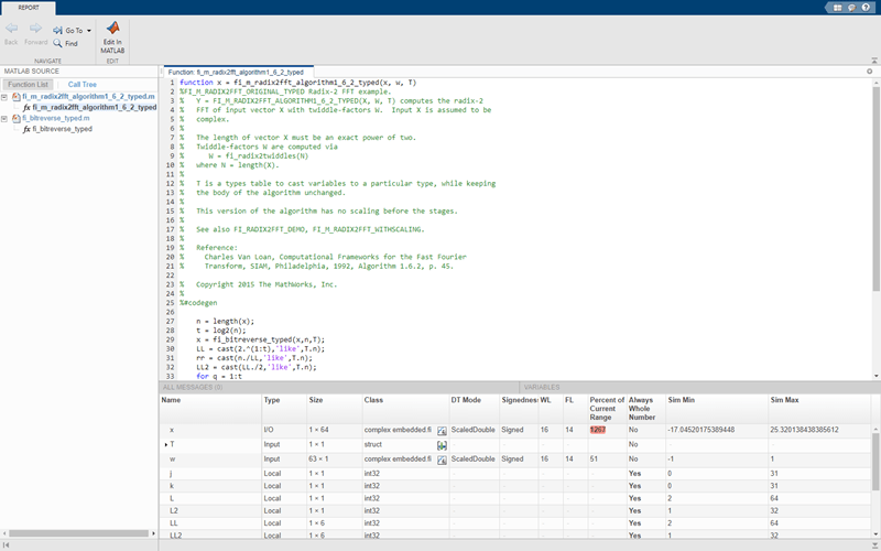 T3 = fi_m_radix2fft_scaled_fixed_types(); % Get fixed point data types declared in table x_scaled_double = cast(x0,'like',T3.x); w_scaled_double = cast(w0,'like',T3.w); buildInstrumentedMex fi_m_radix2fft_algorithm1_6_2_typed ... -o fft_instrumented -args {x_scaled_double w_scaled_double T3}