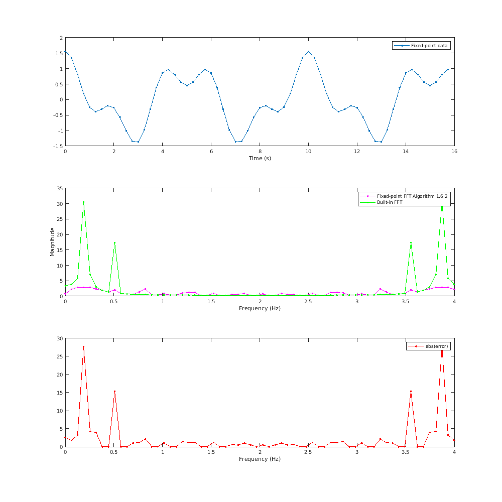 Обратите внимание на то, что график величины (центр) БПФ фиксированной точки не напоминает график встроенного БПФ. Ошибка (нижний график) намного больше, чем, что вы ожидали бы видеть, округляют ошибку, таким образом, вероятно, что переполнение произошло.