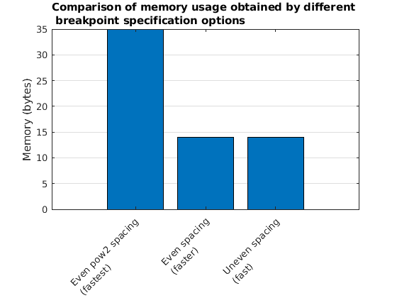 memoryValues = [... totalMemoryUsage(bestEvenPow2SpacingSolution), ... totalMemoryUsage(bestEvenSpacingSolution), ... totalMemoryUsage(bestUnevenSpacingSolution)]; figure(); xTickLabels = {'Even pow2 spacing \newline(fastest)','Even spacing \newline(faster)','Uneven spacing \newline(fast)'}; hMemory = bar(memoryValues); title('Comparison of memory usage obtained by different \newline breakpoint specification options'); hMemory.Parent.XTickLabel = xTickLabels; hMemory.Parent.XTickLabelRotation = 45; hMemory.Parent.YLabel.String = 'Memory (bytes)'; hMemory.Parent.Box = 'on'; hMemory.Parent.YGrid = 'on';