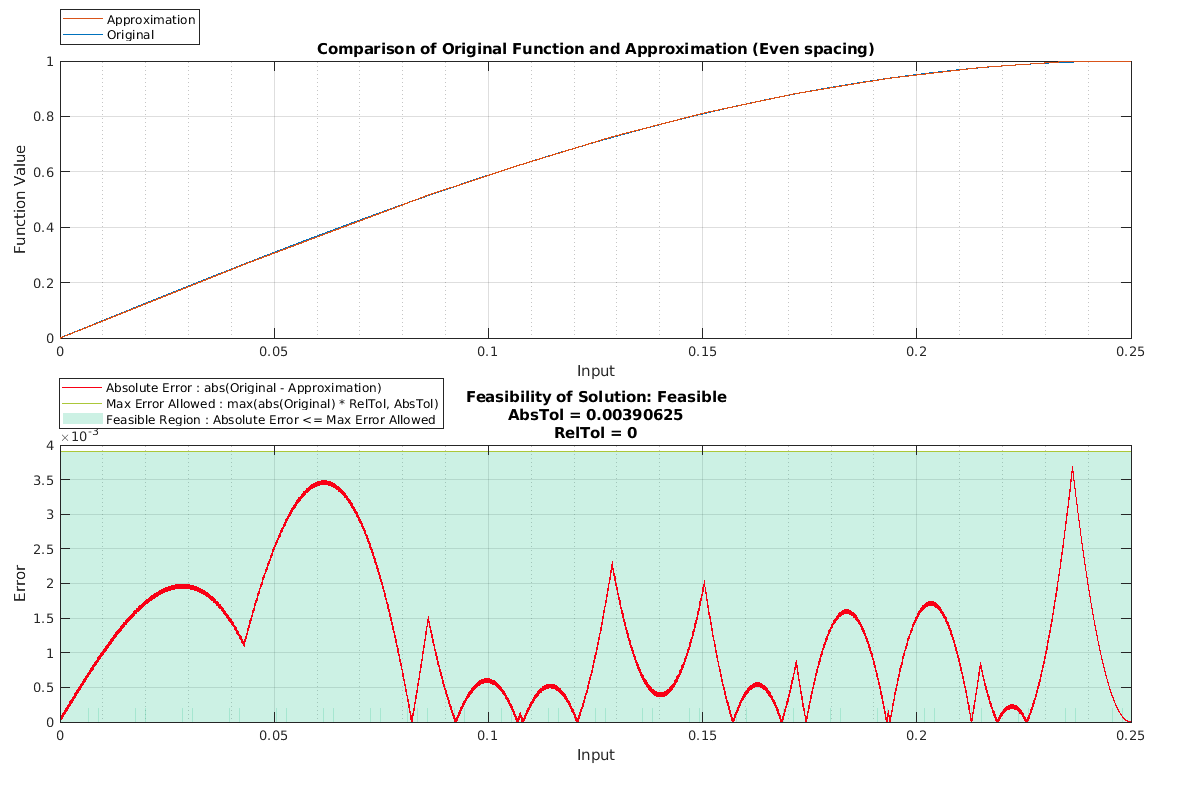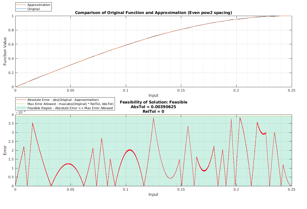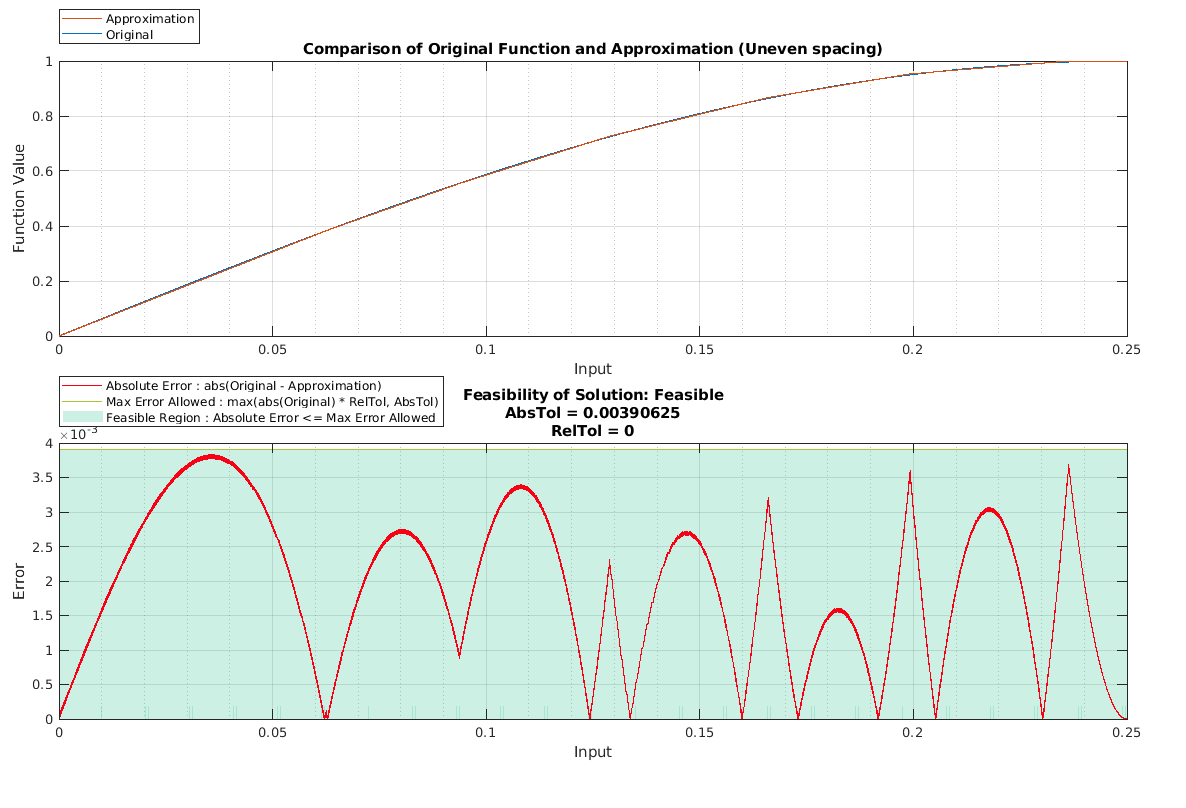 %The software returns several implementations that meet the requirements %specified in the |FunctionApproximation.Problem| and %|FunctionApproximation.Options| objects. You can explore these different %implementations. feasibleSolutions = solution.FeasibleSolutions; tableDataVec = [feasibleSolutions.TableData]; evenSpacingSolutions = find([tableDataVec.IsEvenSpacing]); unevenSpacingSolutions = find(~[tableDataVec.IsEvenSpacing]); evenSolutionsMemoryUsage = arrayfun(@(x) x.totalMemoryUsage(), feasibleSolutions(evenSpacingSolutions)); unevenSolutionsMemoryUsage = arrayfun(@(x) x.totalMemoryUsage(), feasibleSolutions(unevenSpacingSolutions)); bestEvenSpacingSolution = feasibleSolutions(evenSpacingSolutions(evenSolutionsMemoryUsage == min(evenSolutionsMemoryUsage))); bestUnevenSpacingSolution = feasibleSolutions(unevenSpacingSolutions(unevenSolutionsMemoryUsage == min(unevenSolutionsMemoryUsage))); xeven = bestEvenSpacingSolution.TableData.BreakpointValues{1}; yeven = bestEvenSpacingSolution.TableData.TableValues; xuneven = bestUnevenSpacingSolution.TableData.BreakpointValues{1}; yuneven = bestUnevenSpacingSolution.TableData.TableValues; xpow2 = bestEvenPow2SpacingSolution.TableData.BreakpointValues{1}; ypow2 = bestEvenPow2SpacingSolution.TableData.TableValues;