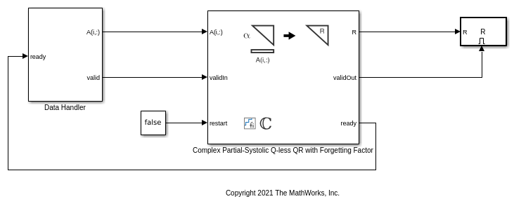 В этом примере показано, как использовать эффективное оборудованием Комплексное Частично-систолическое Разложение Q-less QR с блоком Forgetting Factor.