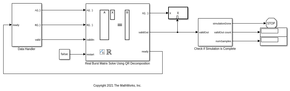 Блок Real Burst Matrix Solve Using QR Decomposition выходные данные одна строка за один раз. Когда строка результата выводится, блок устанавливает validOut к истине. Строки X выводятся в порядке, они вычисляются, последняя строка сначала, таким образом, необходимо восстановить данные, чтобы интерпретировать результаты. Чтобы восстановить матрицу X от выходных данных, используйте функцию помощника matrixSolveModelOutputToArray.