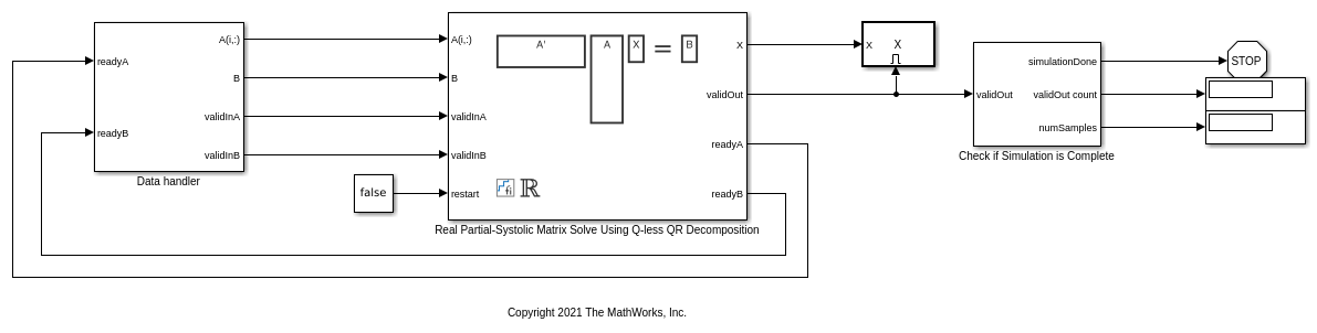 Действительная Частично-систолическая Матрица Решает Используя блок Q-less QR Decomposition выходную матрицу X на каждом временном шаге. Когда допустимая матрица результата выводится, блок устанавливает validOut к истине.