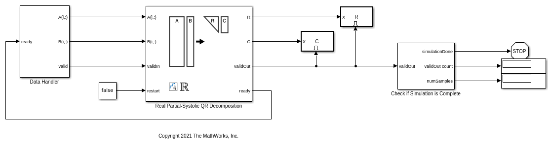 Блок Real Partial-Systolic QR Decomposition выходные матрицы R и C на каждом временном шаге. Когда допустимые матрицы результата выводятся, блок устанавливает validOut к истине.