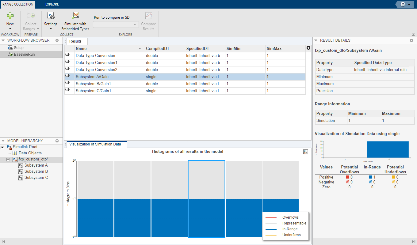 Скомпилированный тип данных (CompiledDT) столбец для BaselineRun показывает тот Subsystem A и Subsystem C используемый single тип данных, в то время как остальная часть модели была симуляцией с помощью double тип данных.