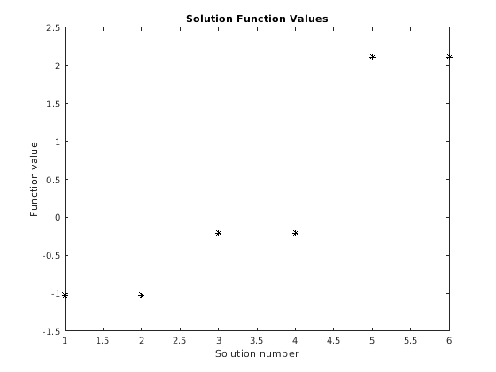 GlobalSearch и MultiStart сгенерируйте вектор из GlobalOptimSolution объекты. Вектор упорядочен значением целевой функции от самого низкого (лучше всего) к (худшему) самому высокому. GlobalSearch и MultiStart объедините решения, которые совпадают с ранее найденными решениями в допусках. Для GlobalSearch детали, смотрите Update Solution Set в Когда Запуски fmincon. Для MultiStart детали, смотрите, Создают Объект GlobalOptimSolution.