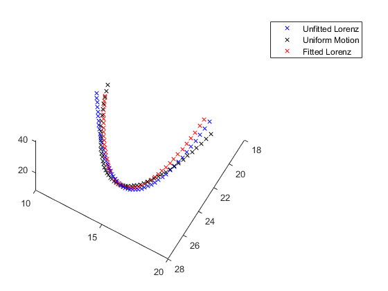 legend('Unfitted Lorenz','Uniform Motion','Fitted Lorenz')