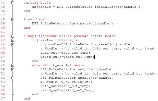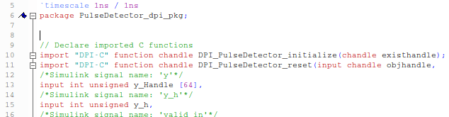 Каждая из подсвеченных частей испытательного стенда UVM реализована путем переноса сгенерированного кода C от Подсистемы Simulink и вызова ее точек входа с помощью DPI. Следующее изображение показывает несколько объявлений функции для подсистемы PulseDetector.