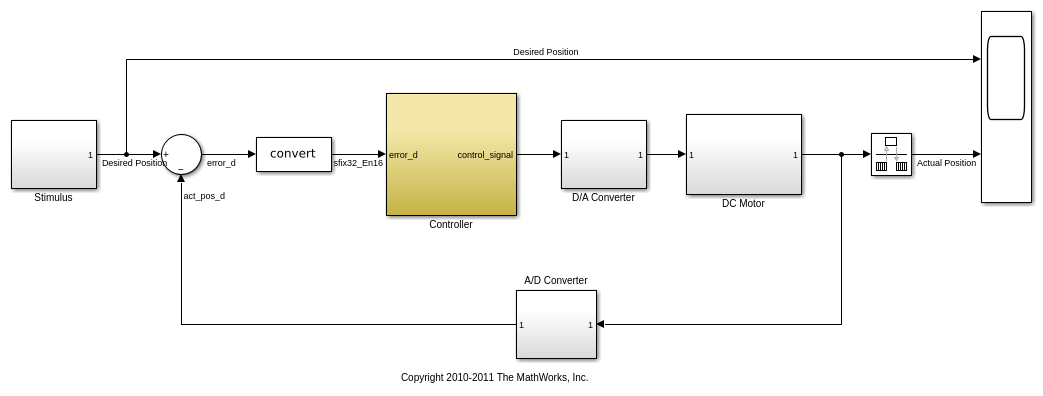 Эта модель содержит ПИД-регулятор фиксированной точки, реализованный с основными блоками Simulink. Эта модель также содержит модель двигателя постоянного тока, которой управляет этот ПИД-регулятор, а также желаемая позиция двигателя постоянного тока входного стимула.